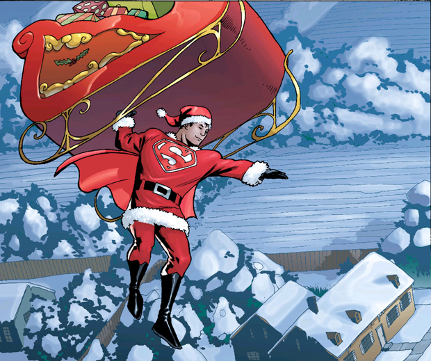 Da kommt Batman zufällig vorbeigeflogen. Lächerlich, sagt er. Superman sei zu höherem berufen, zum Beispiel die Welt zu retten. Richtig, sagt Superman, vielleicht sollte er lieber den Nahen Osten befrieden, aber, naja, die Geschenke möchte er schon noch loswerden. Doch als er bei den Kids auftaucht, steht da schon Bat-Santa. Und Superman, der keinen Spaß versteht, reagiert etwas über – und dabei sehen auch noch Kinder zu …