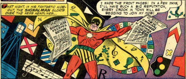 Cobb schlüpft in ein gelb-rot/orangenes Kostüm mit einer Sonne auf der Brust, gestreifter Unterhose und unzähligen Symbolen auf dem Cape. Als Signalman schickt er Batman ein Zeichen: einen Besen mit einem Atomsymbol. Die Spur führt zu einer Hobby-Ausstellung. Signalman entkommt auf raffinierte Weise, indem er die Schilder zweier Türen vertauscht. So steht Batman plötzlich vor einer Besenkammer, statt Signalman durch den Ausgang zu folgen. Derlei getäuscht und gedemütigt, macht sich Batman gar nicht erst die Mühe, die andere Tür zu öffnen. Signalman hat triumphiert!