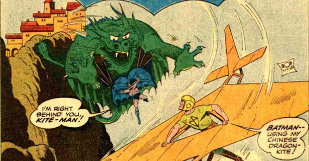 Nach 20 Jahren ging Batman immer mehr die Puste aus. Die Abenteuer wurden immer absurder – die Schurken immer schräger. Einer davon war der Kite-Man (Batman #133, 1960). Ein Mann, der alles mit Flugdrachen erledigt. Zuerst lässt er von einem Gasbomben auf ein Dach abschießen, dann lässt er sich mit einem Drachen hinaufschießen, um einen Rubin zu stehlen. Batman und Robin sind zufällig zur Stelle, wei sie Ehrengäste des Rajas sind. Da hängt sich Robin wagemutig an den Kite-Man dran und lässt sich durch die Lüfte tragen, bis er in einen Wassertank plumpst.
