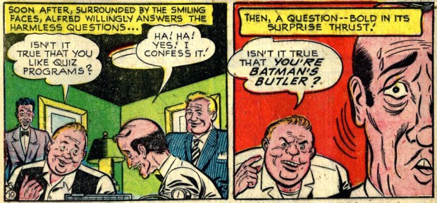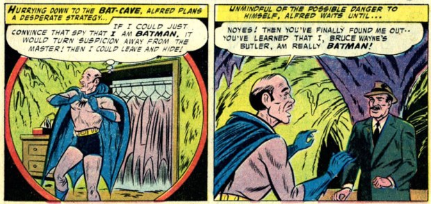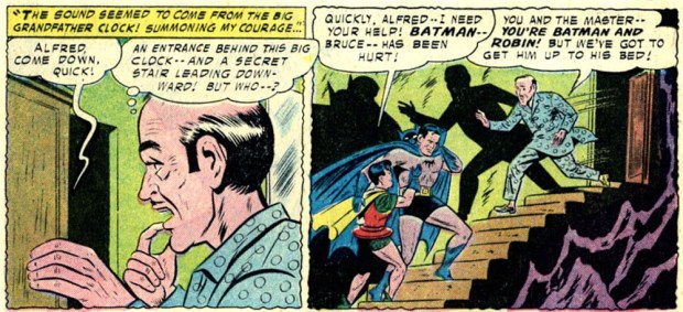 Später erfährt Alfred Bruces Geheimidentität nicht, weil er die Bathöhle entdeckt, sondern weil Dick ihn zur Hilfe ruft, nachdem die beiden von einem Einsatz zurückkommen und Batman am Kopf verletzt ist. Alfred schafft es, Bruces Geheimnis zu bewahren, auch wenn die Lage mal brenzlig wird, zum Beispiel mit der ewig neugierigen Reporterin Vicky Vale. Er macht sich sogar als Erfinder nützlich, indem er aufblasbare Kostüme näht, die Batman und Robin vor dem Ertrinken bewahren sollen.