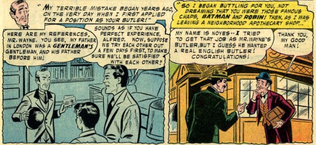 Alfred hat seine Bewährungsprobe erneut bestanden. Er erweist sich als „the greatest gentleman’s gentleman in the world“, wie Batman sagt und er fragt sich: „How did Robin and I ever get along before we had you for a butler?“ Tatsächlich erweist sich Alfred hier als wahres Factotum, ein Mädchen für alles. Ein Butler, der innovative Funktionskostüme näht und Flugzeuge baut – so ein Personal ist wirklich schwer zu kriegen.