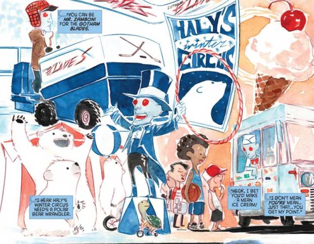 Doch statt ihn einfach nur zu verprügeln, kommen sie mit konstruktiven Vorschlägen: Wenn Mr. Freeze Kindern helfen wolle, könne er sich anderweitig nützlich machen: auf der Eisfläche beim Eishockey, im Zirkus als Polarbär-Dompteur oder als Eisverkäufer. Aber Mr. Freeze mag nicht, er will auch nicht zum Weihnachtssingen – er hockt lieber traurig in Arkham. Dann kommen die Kinder halt zu ihm und singen ihm was vor …