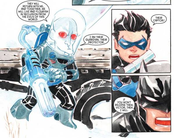 Hier könnte die Geschichte unglaubwürdig werden, aber dann kommt zum Glück eine halbwegs glaubwürdige Erklärung: Da das Serum nicht ausgereift war, greift es Noras Gehirn an – sie wird zur Soziopathin. Nachdem sie ihren Mann fallen lässt, bittet Victor Freeze Batman um Hilfe, seine gemeingefährliche Frau wieder einzufangen. Und so kommt es zum Team-up von Eis und Heiß …