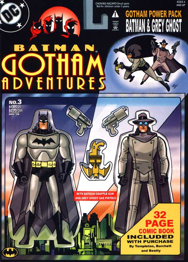 In der Premierenausgabe setzte der Vater eines Joker-Opfers ein Kopfgeld auf den Schurken aus, sodass Batman und Co. ihn vor mordlüstigen Bürgern bewahren mussten. In der dritten Ausgabe dann dieses geniale Cover: Batman und Grey Ghost als Actionfiguren, inklusive Zubehör, Gaspistole und Greifhaken (Achtung: Erstickungsgefahr für Kinder unter drei Jahren!), das 32-seitige Comicheft wird nur als Beilage angekündigt, aber es ist so viel mehr als das.