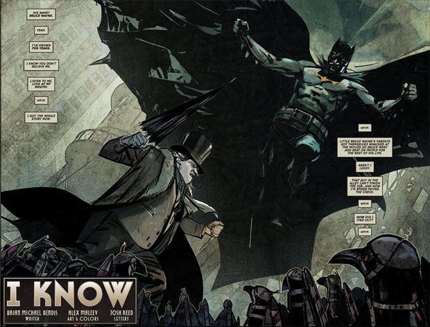 Dafür ist I Know einer der Höhepunkte. Brian Michael Bendis erzählt von einem alten Pinguin, der auf einen alten Bruce Wayne trifft und ihm sagt, er hätte schon lange gewusst, dass er Batman sei. Alex Maleev inszeniert es nicht nur herrlich atmosphärisch und lebendig, sondern auch mit gelungenen Anspielungen auf den Pinguin im Film Batman Returns (1992).