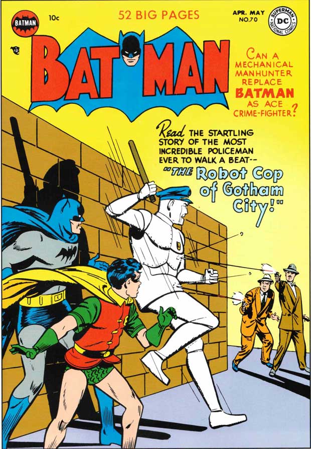 Auch Batman beschäftigt diese Frage, und das bereits im Jahr 1952. Der Dunkle Ritter war schon immer angewiesen auf Technik. Um nicht zu sagen: ein Technik-Freak. Ohne Gadgets kein Batman. Sein Batmobil ist stets auf dem neuesten Stand, wenn nicht gar der Zeit voraus, ganz zu schweigen vom Batplane und anderen fantastischen Erfindungen. Doch 1952 (Batman #70) führt die Polizei einen „Robot Cop“ ein, der äußerlich kaum von einem Menschen zu unterscheiden ist, aber dafür fast alles besser kann, vor allem ist er unverwundbar.